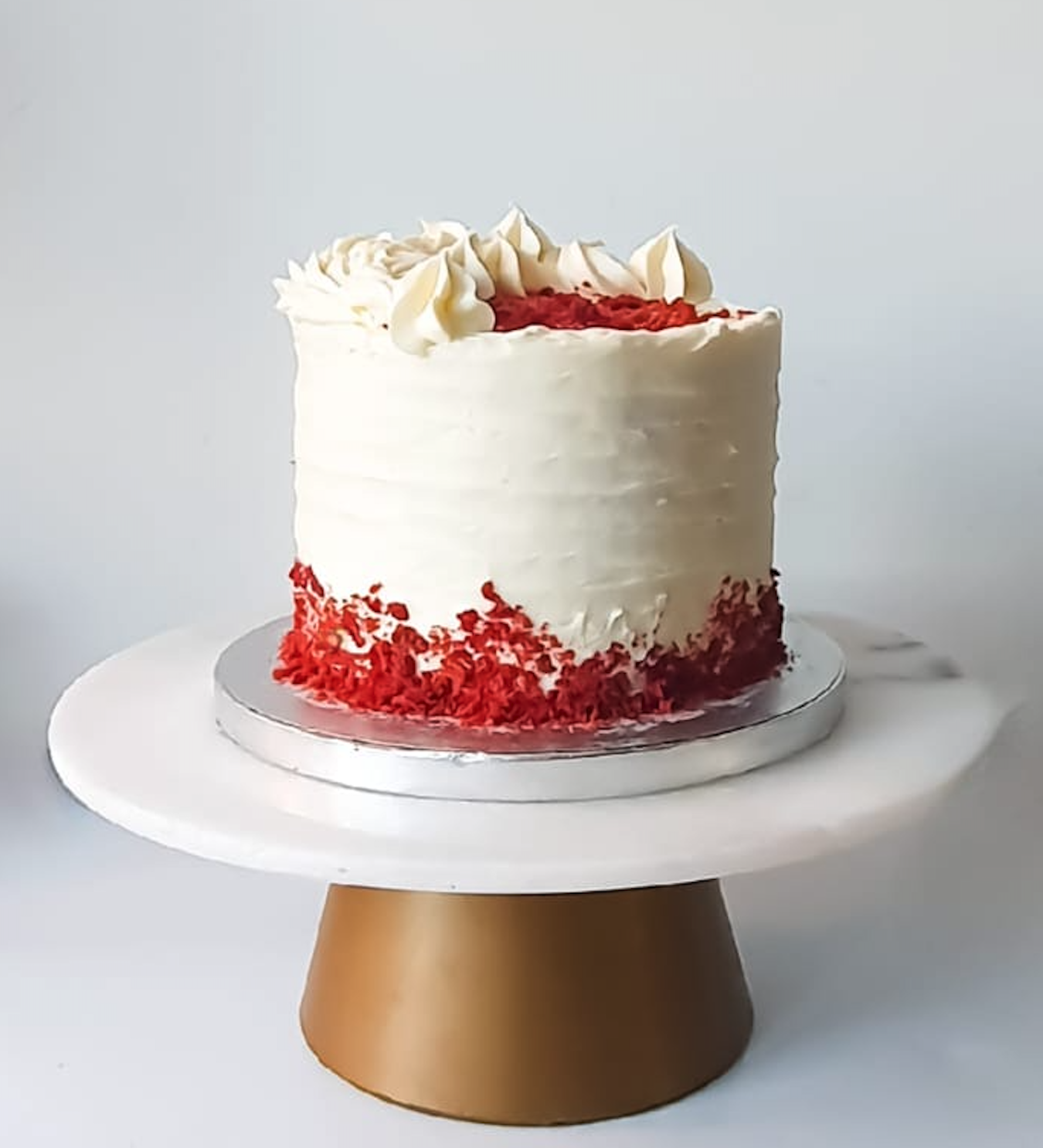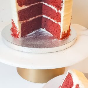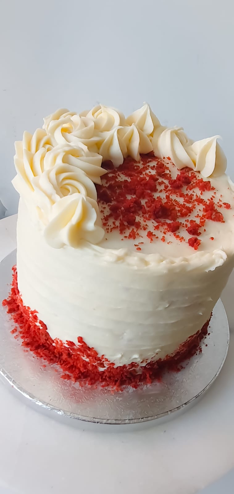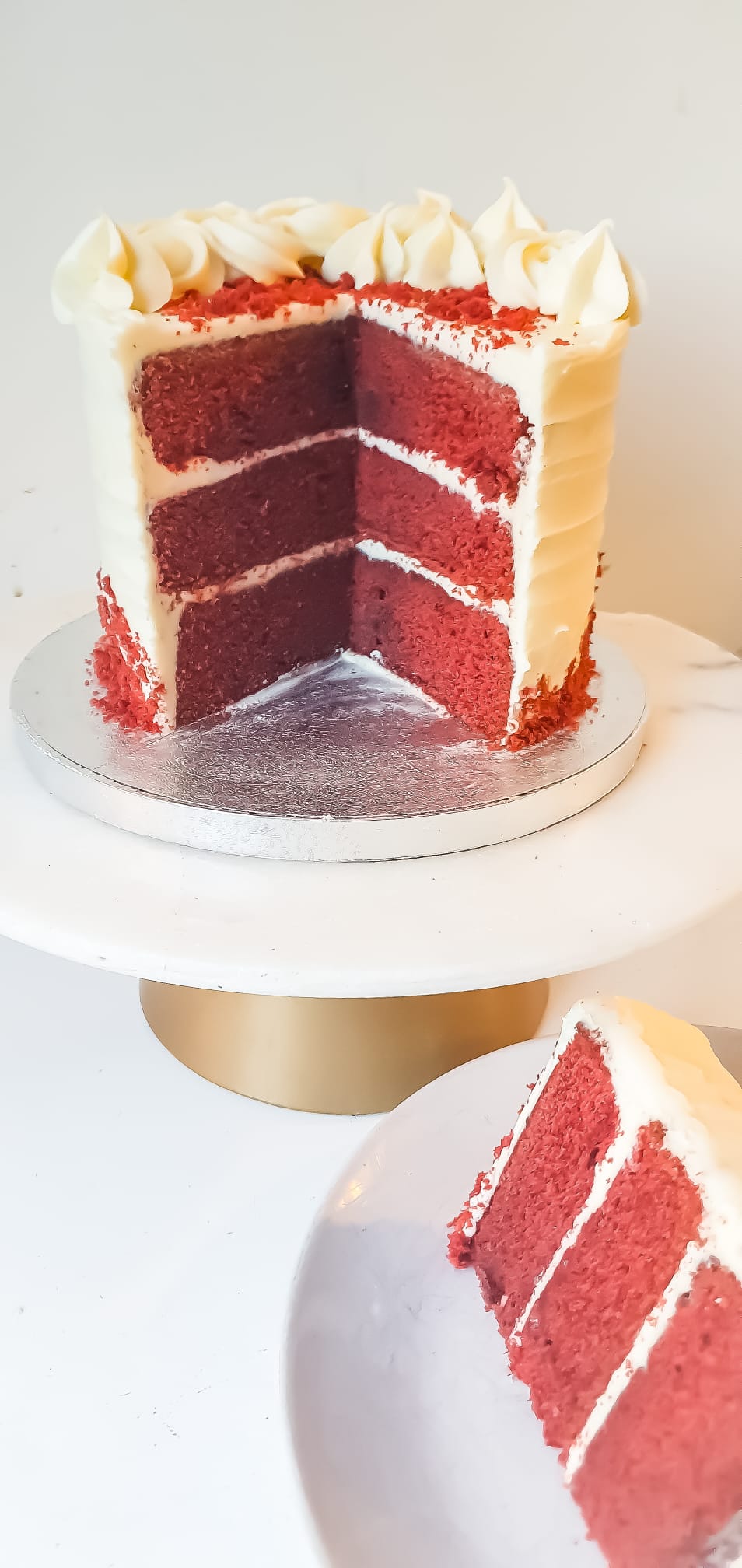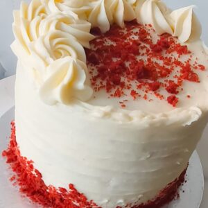 A soft and tasty red velvet cake filled with layers of cream cheese frosting and decorated with our amazing red velvet crumb sprinkle. Contains: Dairy, Egg, Gluten