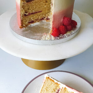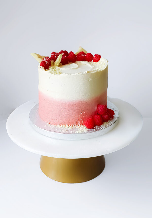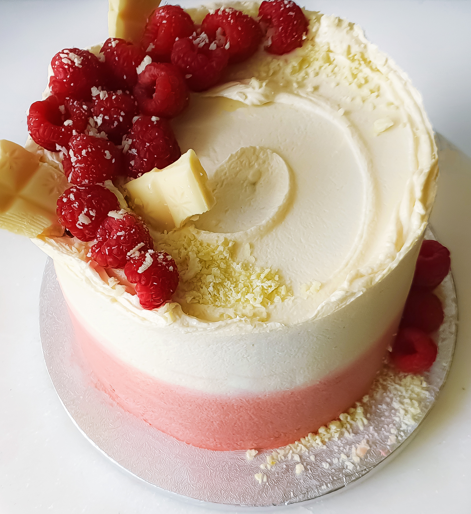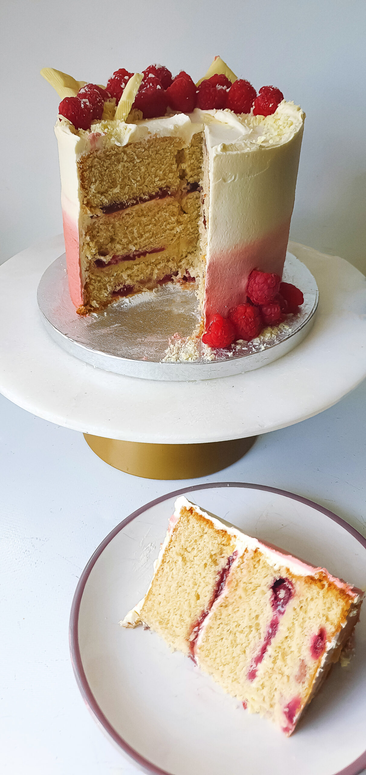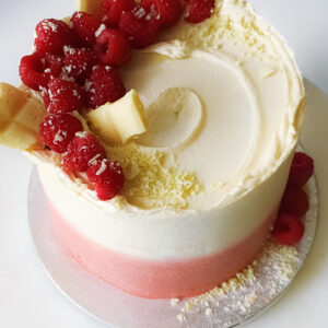 A decadent sponge cake with real white chocolate pieces and fresh raspberries, filled with layers of white chocolate buttercream, raspberry jam and white chocolate ganache. Contains: Dairy, Egg, Gluten